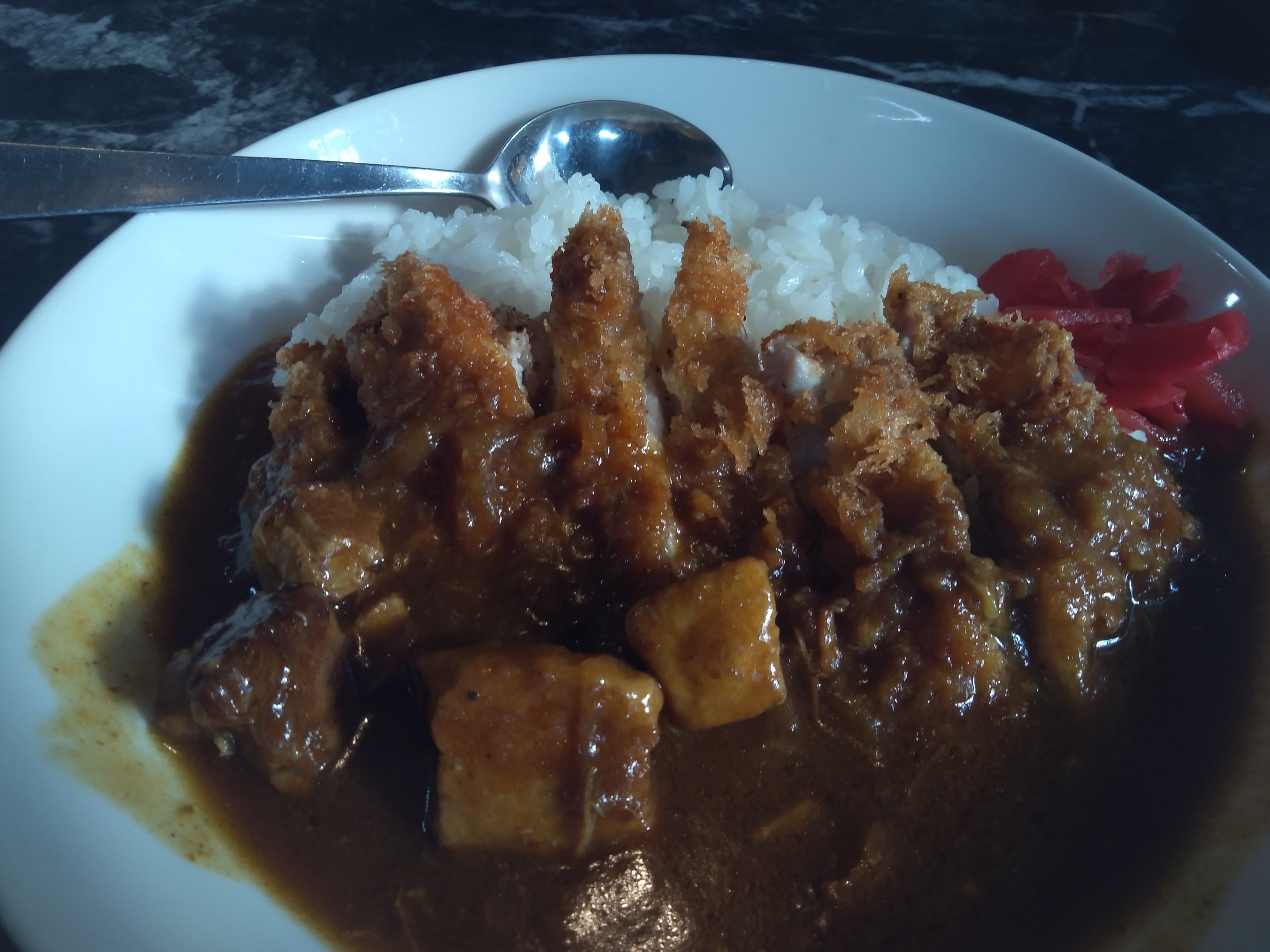 普通のカレーだけでは寂しい時は、やはりカツカレーにかぎる。。。 お店によっては肉(豚ロ―ス)がペラペラで、衣ばかりが目立ってしまう場合もあるが、そこは仕方なく、ちょっと辛めで濃い味のル―であれば、まぁOKかなって思う。 カリッとした、カツの歯触りとトロッとしたカレーのル―が絡み合い、満足出来るボリュ―ム。。。 時々、無性に食べたくなる。