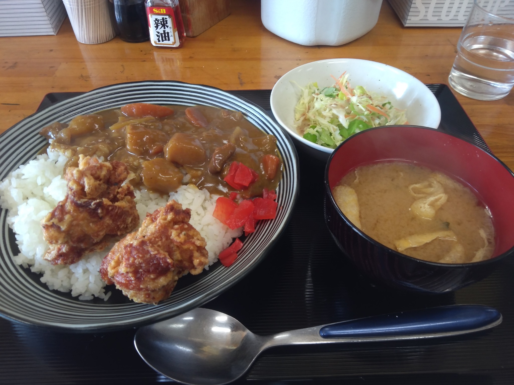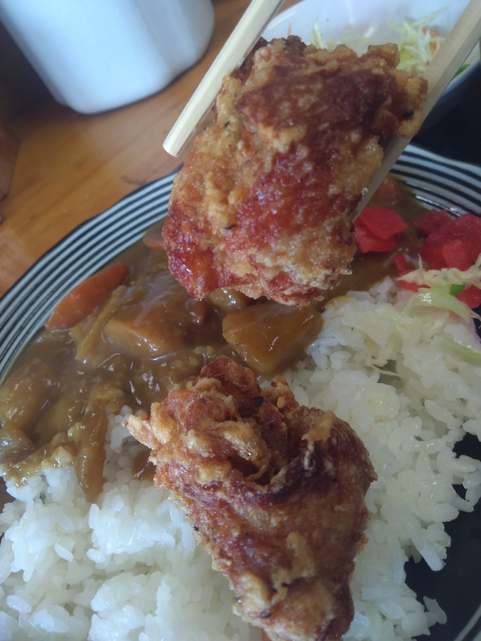 昨日は、二つの企業様が御来社された。 はじめに御来社された企業様は、埼玉県で数店舗を運営されてる取引先様。そして後から御来社された企業様は、同じく埼玉県内の加工会社様だ。 ・・・ほぼほぼ時間帯が被るため、御来社目的にあわせ、案内係を二組にわけ、アテンドする。。。 果たして御参考になれたか?などと考えながら、ちょっと空いた時間でランチ。。。 サさっと、はやく食べられる、カレーライス。 オマケに唐揚げ。