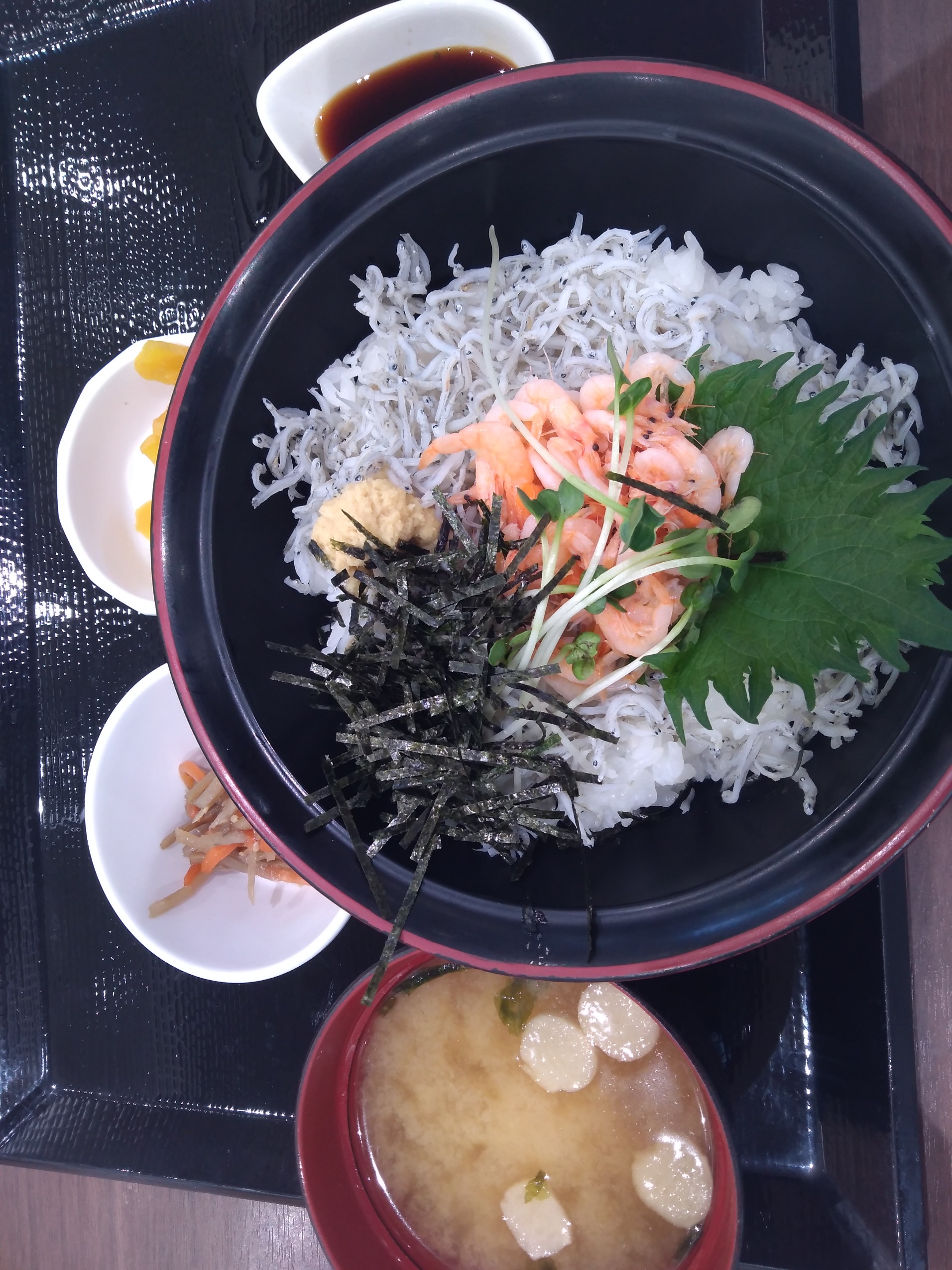 しらす自体が以外と塩味が効いてるので、備え付けの醤油は、少し垂らす程度がいい。